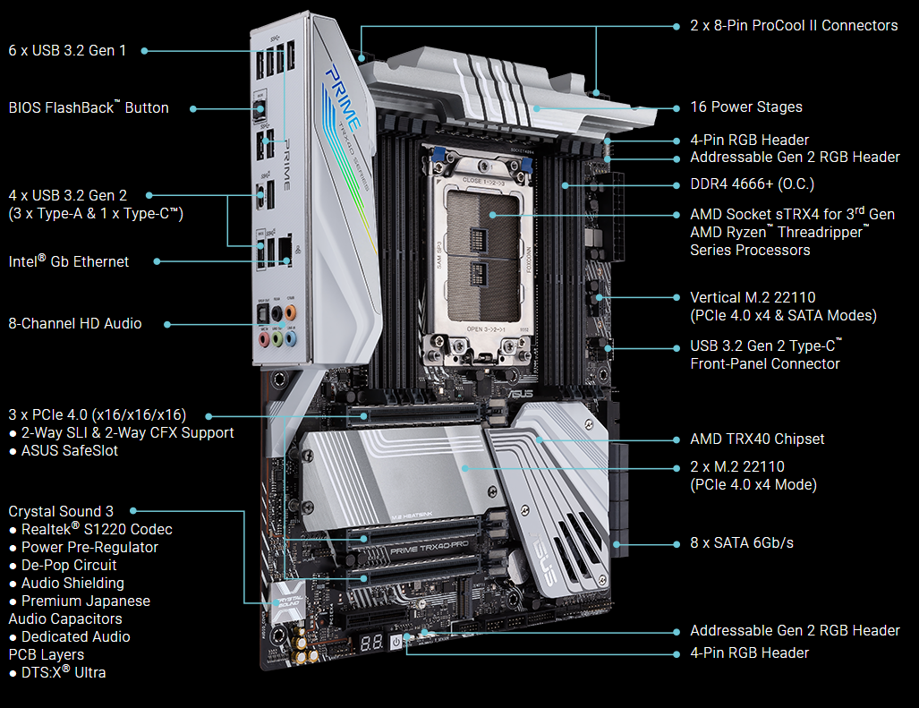 Amazon Com Asus Prime Trx40 Pro Amd 3rd Gen Ryzen Threadripper Strx4 Atx Motherboard With Ddr4 M 2 Usb 3 2 Gen2 Type C Front Panel Connector And Aura Sync Rgb Lighting Computers Accessories